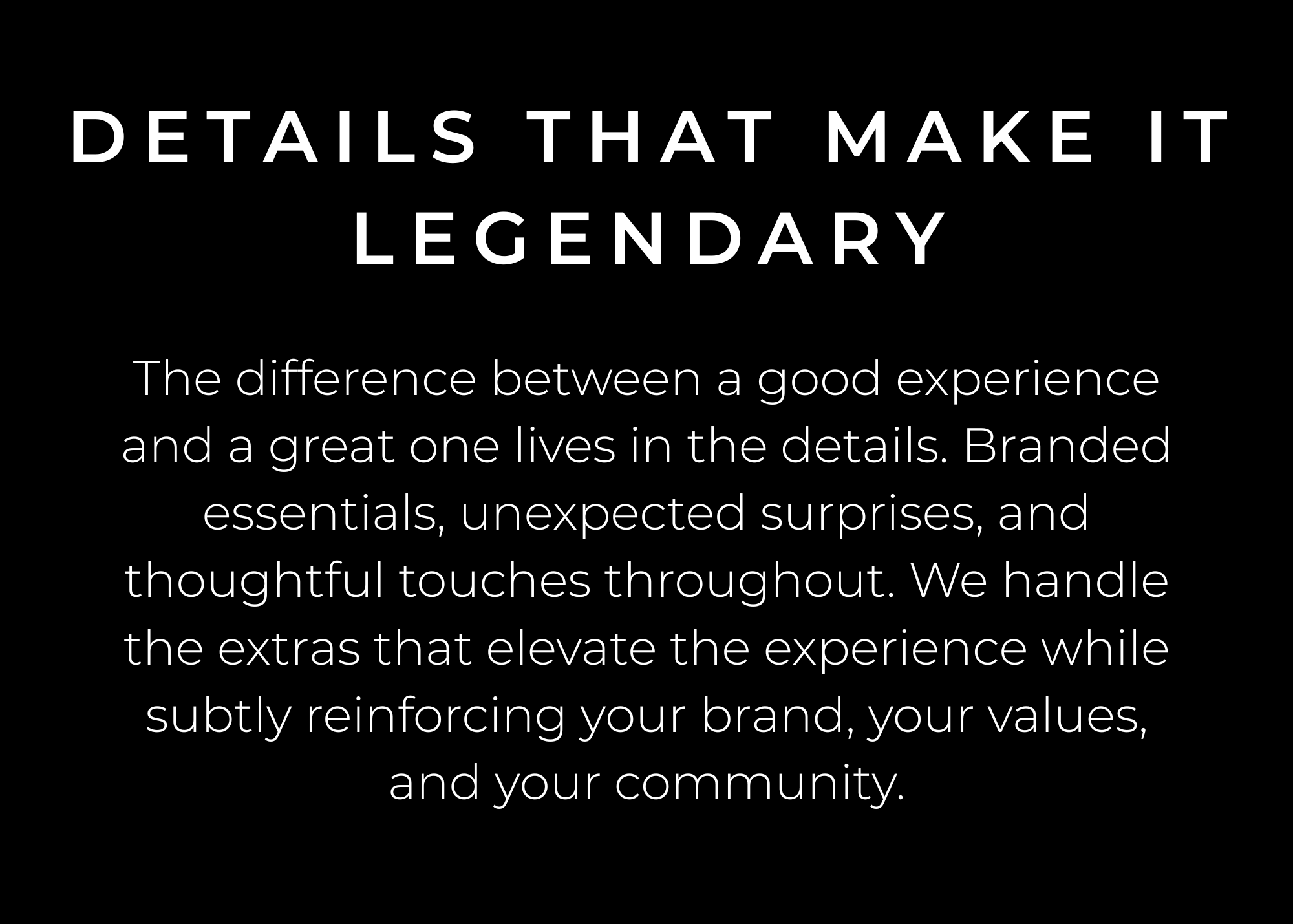 Custom Touches & Thoughtful Details - From branded welcome kits and personalized gifts to little surprises throughout your event, we handle the details that turn a great event into an unforgettable experience.