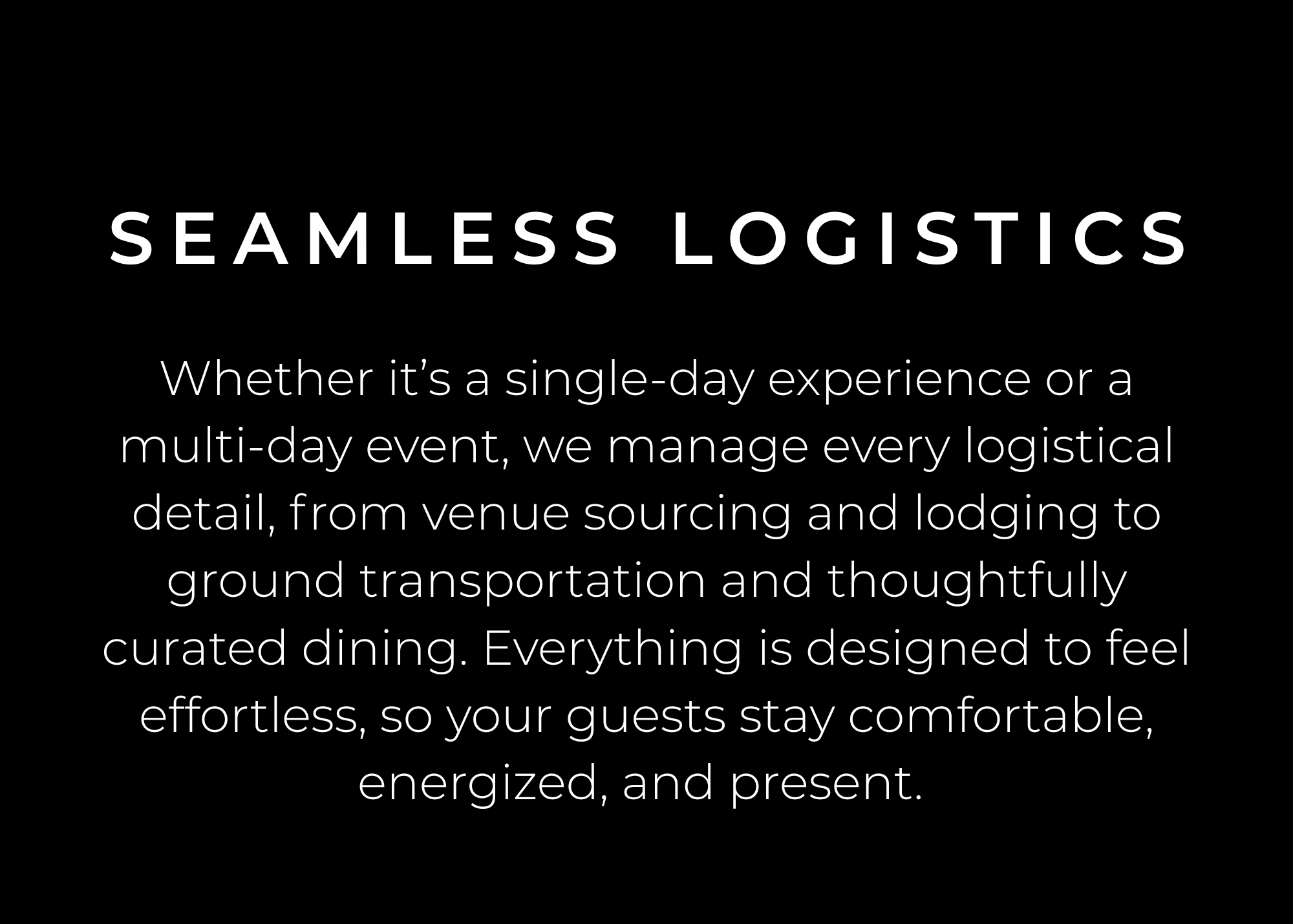 Venues, Transport, or Lodging - We handle every logistical detail, from sourcing the perfect venue and coordinating lodging to managing ground transportation, so your group arrives relaxed, energized, and ready to experience the moment. You show up; we take care of the rest.