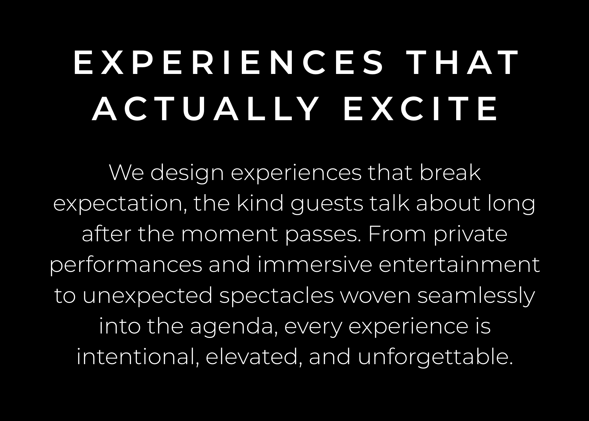 Entertainment & Performances- From private concerts and immersive experiences to curated spectacles, we create moments that excite, inspire, and stick. Every performance is designed to elevate your event and leave a lasting impression.